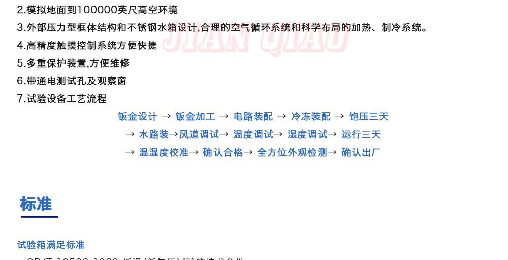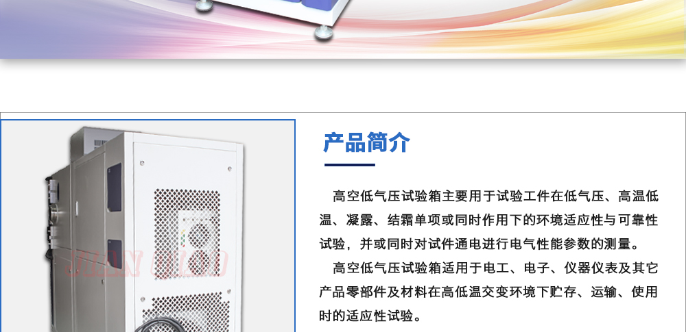 用途:高空低氣壓試驗(yàn)箱主要用于試驗(yàn)工件在低氣壓、高溫低溫、凝露、結(jié)霜單項(xiàng)或同時(shí)作用下的環(huán)境適應(yīng)性與可靠性試驗(yàn),并或同時(shí)對試件通電進(jìn)行電氣性能參數(shù)的測量。高空低氣壓試驗(yàn)箱