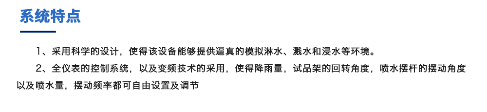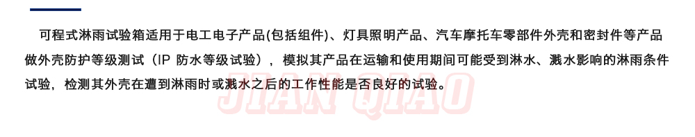 用途:可程式淋雨試驗箱適用于電工電子產(chǎn)品(包括組件)、燈具照明產(chǎn)品、汽車摩托車零部件外殼和密封件等產(chǎn)品做外殼防護等級測試(IP 防水等級試驗),模擬其產(chǎn)品在運輸和使用期間可能受