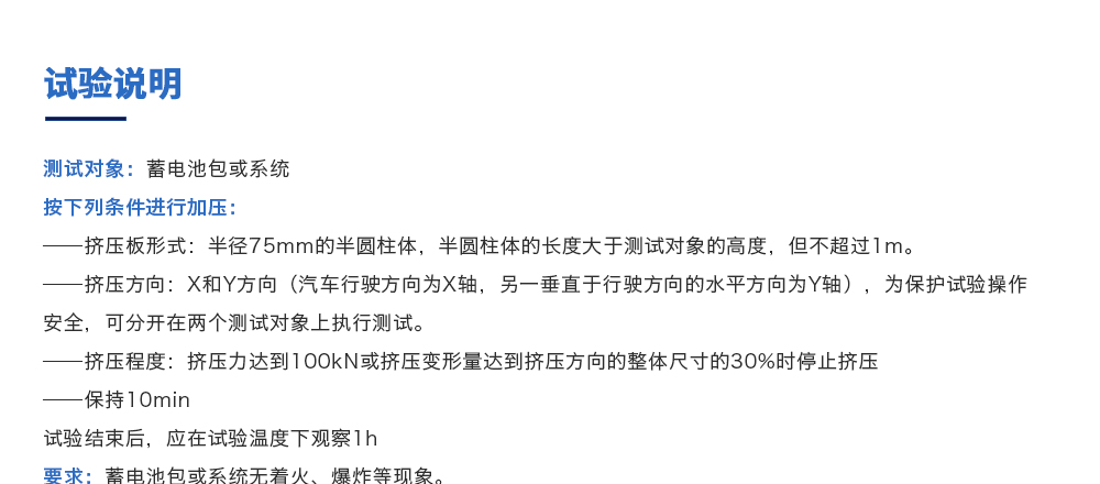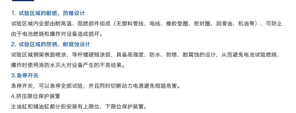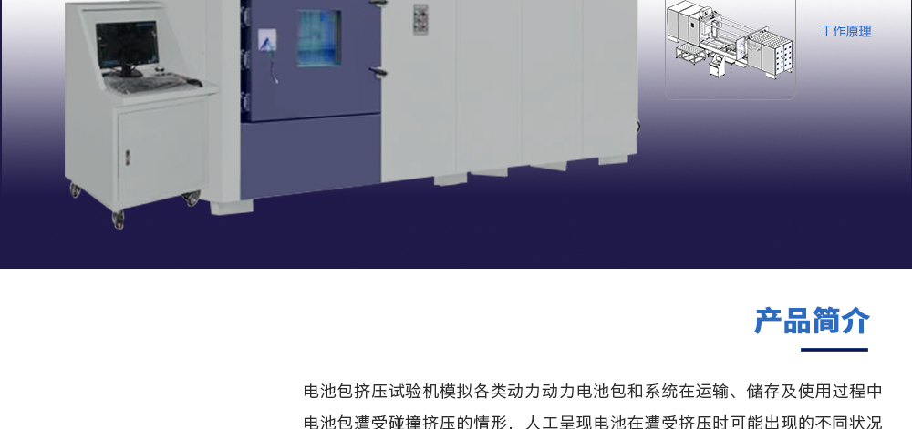 用途:電池包擠壓試驗機模擬各類動力動力電池包和系統在運輸、儲存及使用過程中電池包遭受碰撞擠壓的情形,人工呈現電池在遭受擠壓時可能出現的不同狀況。